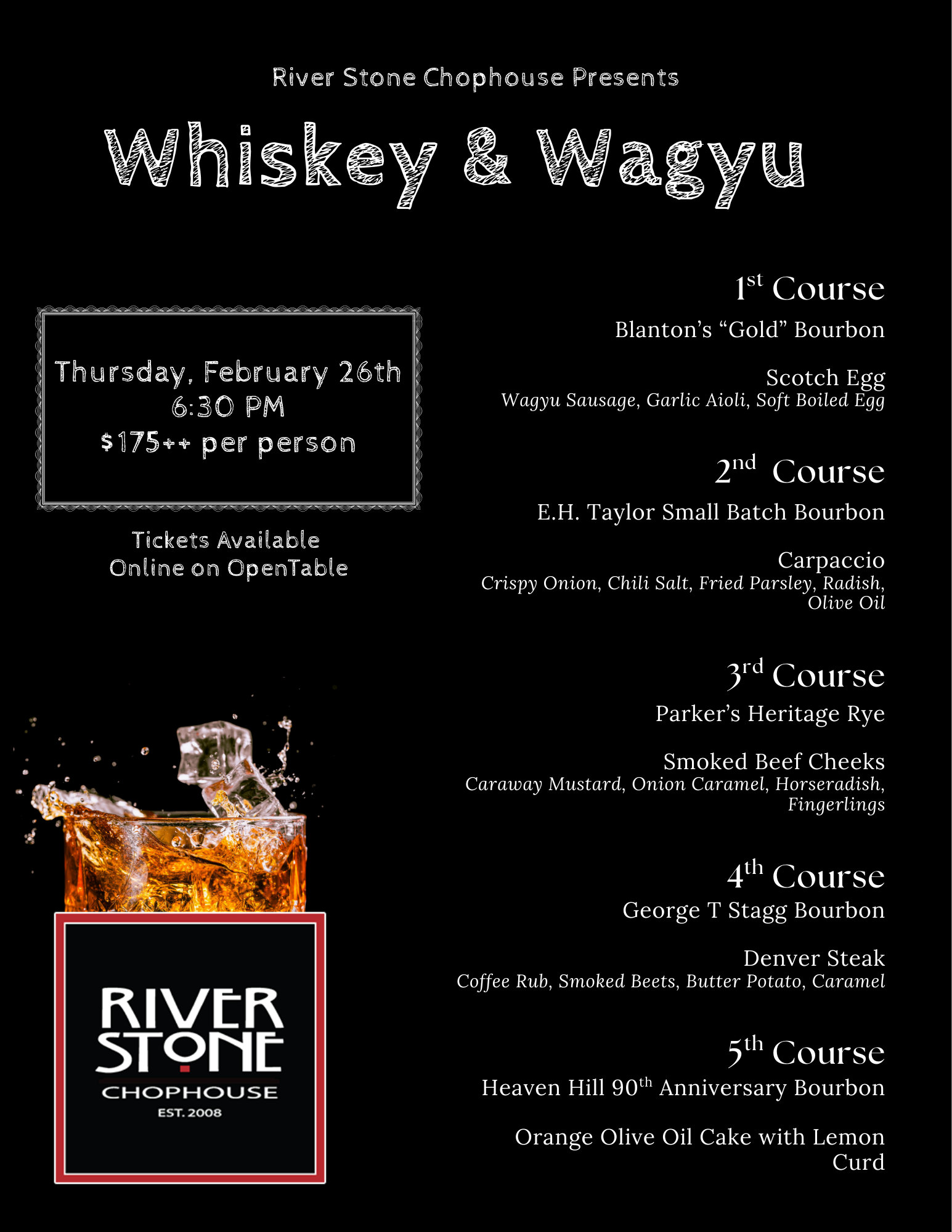 Whiskey and Wagyu Dinner Thursday, February 26, 2026 6:30 PM 8:30 PM 18:30 20:30 River Stone Chophouse 8032 Harbour View Boulevard Suffolk, VA, 23435 United States (map) Google Calendar ICS Book Here!